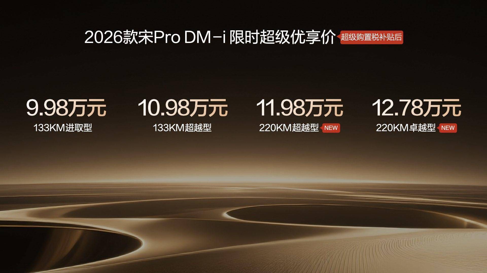 2026年1月10日,比亚迪2026款宋Pro DM-i全系上市,限时超级优享价9.98万-12.78万元。最值得关注的是,此次上市推出220km长续航版本,限时起售价11.98万元,新车不仅是续航明显提升,在乘坐舒适度、智能化以及安全性方面都得到全面提升。